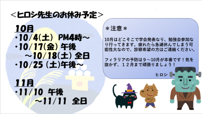 ヒロシ先生の10~11月のお休み予定です。急遽お休みいただく場合もありますので、診察希望の方はお電話ください。
