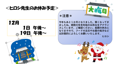 ヒロシ先生のお休み12月分です。ご確認ください。