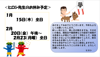 1~2月のヒロシ先生のお休みです。ご確認ください。