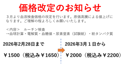 3月より血液検査の一部価格改定を行います。物価高騰のため、ご理解の程よろしくお願いいたします。